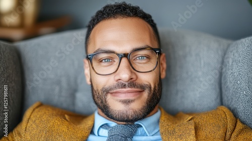 Closeup portrait of a dark skinned man wearing eyeglasses and a mustard yellow blazer, seated in a light gray armchair. He has a pleasant expression