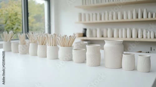 White ceramic pottery in a workshop, view of unfired items, showcasing craftsmanship, potential use for a product catalog or educational purposes