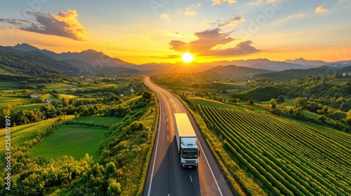 Cargo truck driving through european landscape at sunset wide-angle medium shot natural scenery scenic view