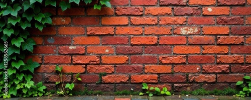 Weathered red brick wall with ivy vines and moss, stone, ivy, garden