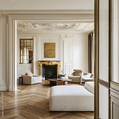 Chic parisian apartment living room with fireplace and elegant herringbone flooring design