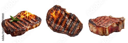 Grilled steaks on a black background, showcasing textures.