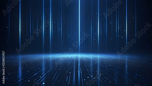 Una escena futurista con un fondo azul oscuro iluminado por rayos verticales de luz y partículas brillantes dispersas, creando un efecto brillante