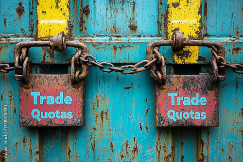 Rusty shipping containers secured with chains and padlocks, labeled Trade Quotas, evoke sense of restriction and control in trade practices