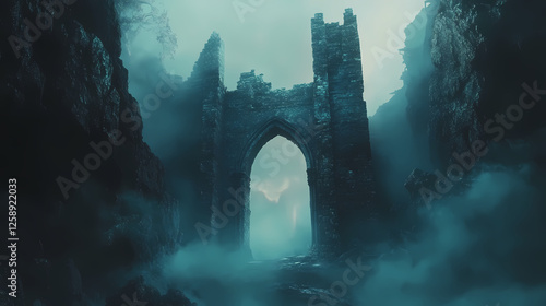 Ancient ruins conceal a hidden teleport gate, activated by a time traveler. Enchanted Foglands. Illustration