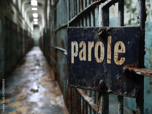 Prison Corridor Featuring Rusted Bars and a Prominent Parole Sign Highlighting Themes of Incarceration and Potential Freedom Within Confined Spaces