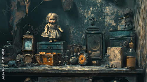 Old, creepy items like antique dolls or cursed relics with dark, ominous backgrounds. cursed & haunted objects. illustration. Haunted Relics. Illustration