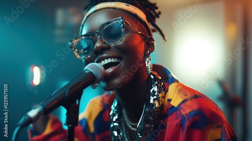 Vibrant Singer Performing on Stage with Microphone and Lights
