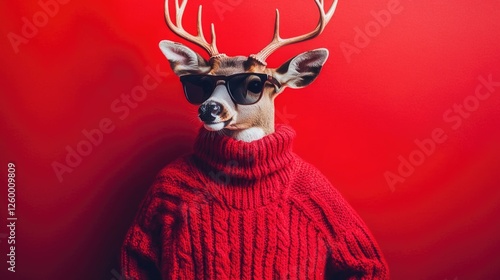 Photo of a deer wearing a santa hat against red background, creating a festive holiday feel.