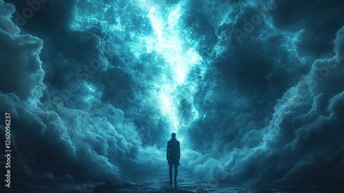 facing my faith conceptual image of a man standing in the middle of a stormy sky looking at the light