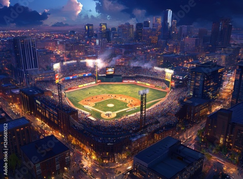 Aerial view of an open-air baseball stadium in a downtown area at night, filled with cheering fans and lights, surrounded by city buildings, an illuminated skyline, and bustling streets below.