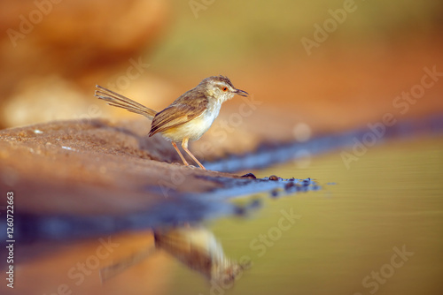 Black chested Prinia standing along waterhole with reflection in morning light in Greater Kruger National park, South Africa ; Specie Prinia flavicans family of Cisticolidae