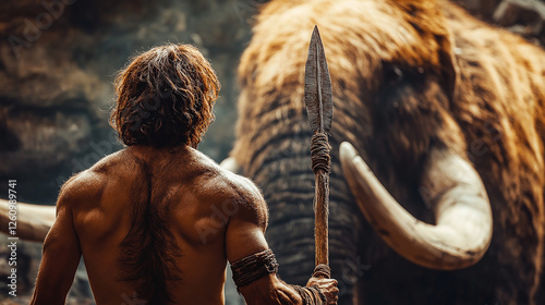 Hunter ready to hunt woolly mammoth. He's armed with a spear. Ancient man prepares for a dangerous hunting. Back view of Hunter with his spear.