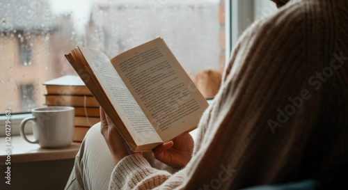 Person reading book by rainy window, with coffee and books
