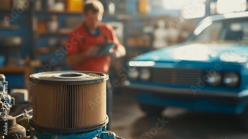 Close-up of a used car air filter in a repair shop with a mechanic and classic car in the background.