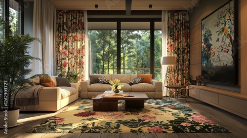 Sunlit Living Room with Floral Accents and Panoramic Views