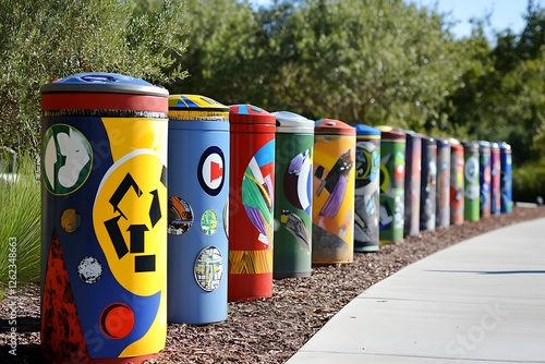 a vibrant array of uniquely designed recycling bins lining a park pathway, highlighting waste reduction and eco-friendly practices in a natural, outdoor setting with dappled sunlight