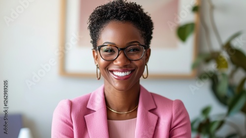 A confident woman with short curly hair smiles warmly, wearing glasses and a pink blazer, against a modern, bright office backdrop.