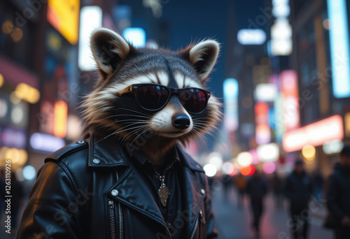 Mapache con una chaqueta de cuero negra y gafas de sol retro, que exuda una actitud rebelde frente al paisaje nocturno de la ciudad