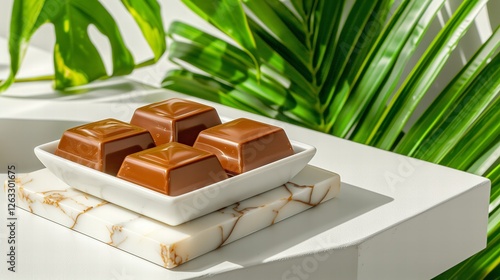 Czekoladowe cukierki na białym talerzu z tropikalnymi liśćmi i marmurową powierzchnią