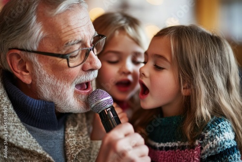 A nostalgic scene of an older man singing with two young girls, possibly at a talent show or family gathering
