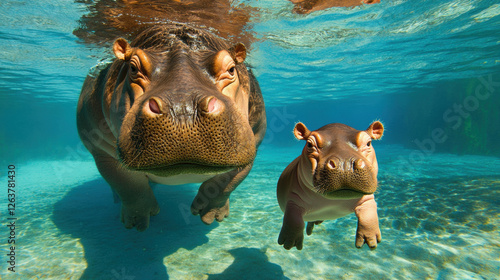 Cutie Pie, A baby hippo swims next to its large mother in a high-fidelity image showcasing their natural bond.