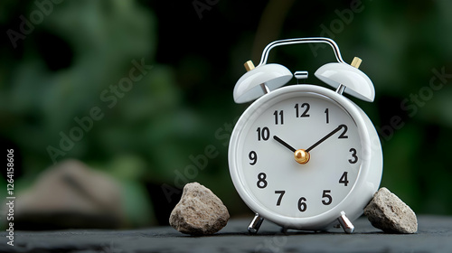 White alarm clock, rocks, nature background; time management concept