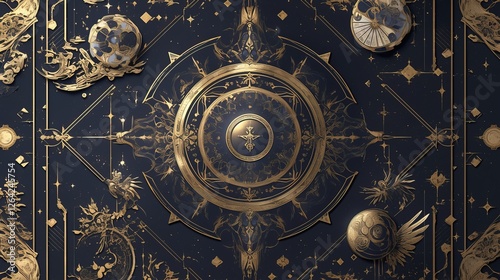 Golden celestial compass on ornate dark background with symbols