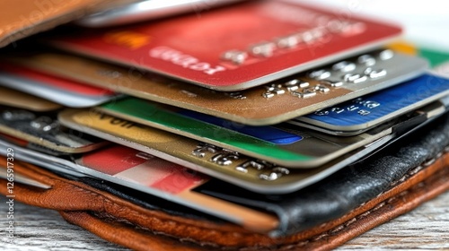 Closeup of many credit cards stacked in a leather wallet on a light wood surface