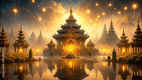 Ancient temple with intricate carvings, golden light, and misty atmosphere, reflecting the mystique of Gold star festival, spiritual ambiance , ancient temple