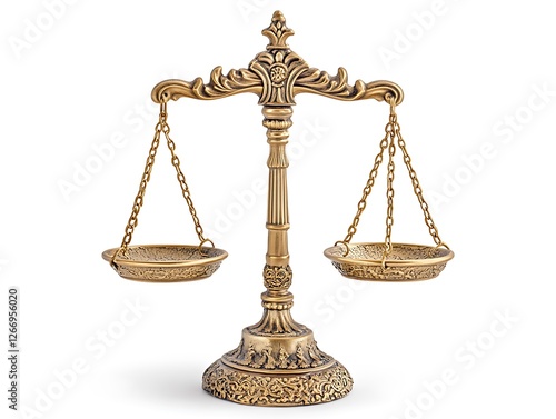 Antique-Style Golden Balance Scales Symbolizing Justice, Fairness, and Legal Equality, Isolated on a White Background for Law, Ethics, and Weighing Concepts