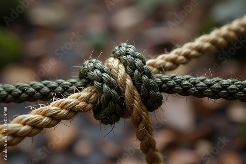 A detailed outdoor survival scene featuring a close-up of a strong knot tied with two contrasting ropes—one made of rugged paracord and the other a thick natural jute rope. The knot is centered, highl