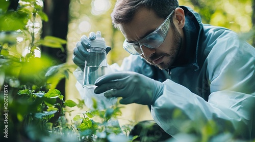 Environmental Scientist Examining Water Sample in Forest Detailed Research Ecology Study Nature Conservation Professional Researcher Analyzing Liquid