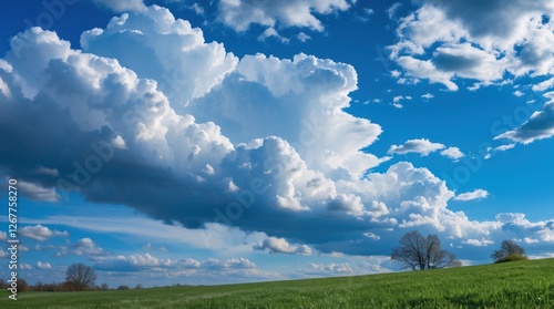 Scenic landscape with lush green field and dramatic cloud formations under a bright blue sky with copy space for text.