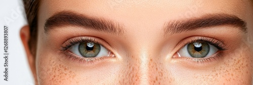 Freckled Face Woman's Eyes Close Up - Close-up of a woman's eyes, showcasing freckles, natural beauty, youth, and healthy skin. The symbolizes confidence, allure and natural charm
