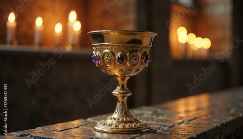 Ornate Gold Chalice with Purple Gems Surrounded by Candlelight