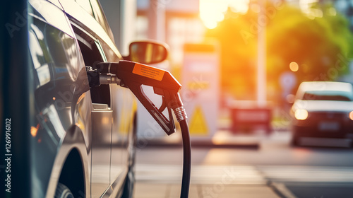 Close up of a fuel pump refueling a car at a gas station. The image captures the refueling process in detail.