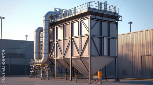Industrial dust collector in a construction site, emphasizing air filtration and pollution control.