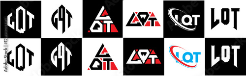 LQT letter logo design in six style. LQT polygon, circle, triangle, hexagon, flat and simple style with black and white color variation letter logo set in one artboard. LQT minimalist and classic logo