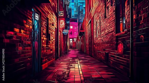 Artistic alleyway bursting with color and illuminated by vibrant nightlife lights : Generative AI