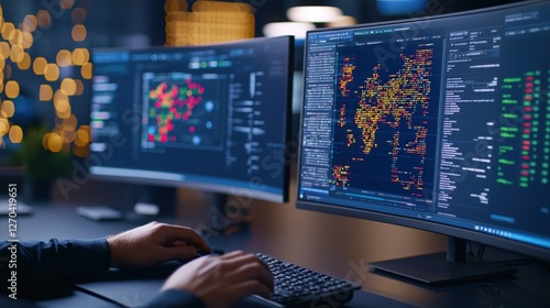 A person interacts with dual monitors displaying colorful data visualizations, including a world map and graphs, in a modern, dimly lit workspace.