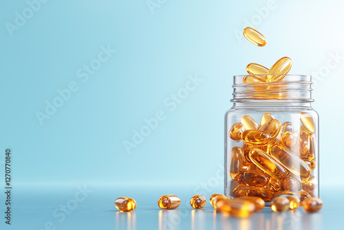 Omega Capsules Floating into Transparent Jar for Wellness and Healthcare