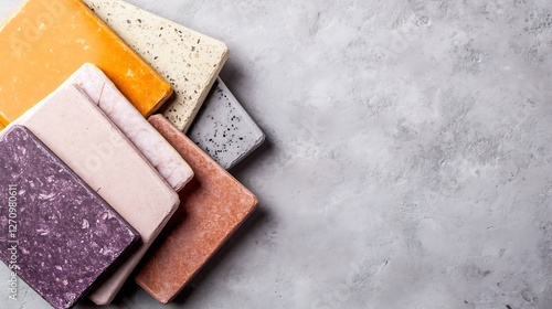 An assortment of colorful handmade soap bars on gray concrete background displaying variety and craftsmanship : Generative AI