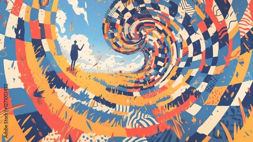 Man in suit explores surreal swirling landscape of color and pattern