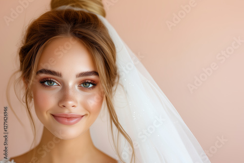 Atrakcyjna kobieta z brokatowym makijażem i welonem w studio na różowym tle
