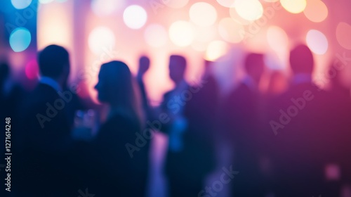 Blurred corporate networking event with silhouettes of businesspeople discussing deals and exchanging contacts, professional and elegant.