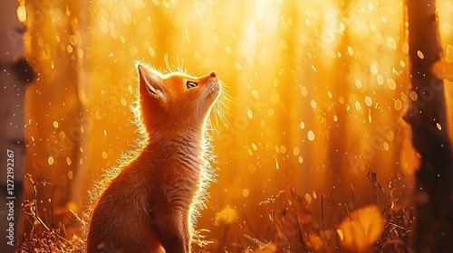 A cat gazes upward in the center of a forest as raindrops fall upon its fur