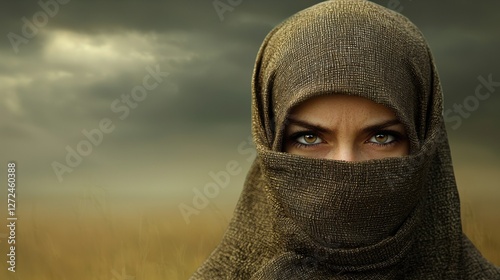 A mysterious woman with striking blue eyes partially concealed by a dark scarf, set against a dramatic, cloudy background.