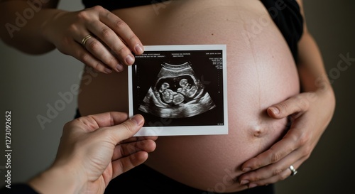 A couple admires an ultrasound image of their twins while celebrating their pregnancy journey