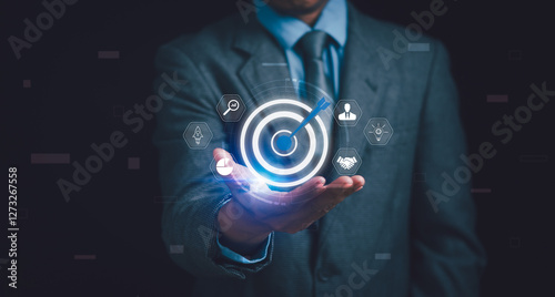 Concept of goals and objectives , businessman hand showing dartboard and arrow to define business target , business plan , marketing , strategy or organization mission